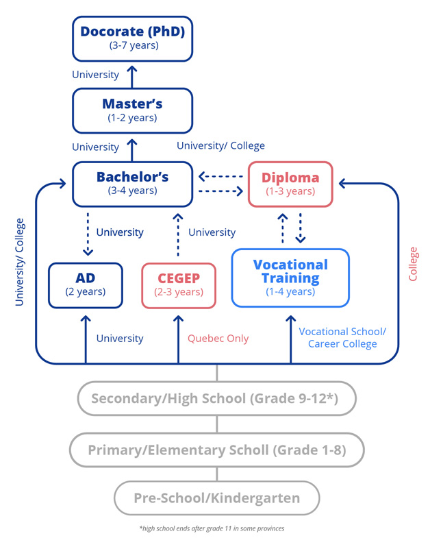 The Canada education at the post-secondary level can be acquired from universities, university colleges, Community colleges, Career Colleges and Technical institutes.